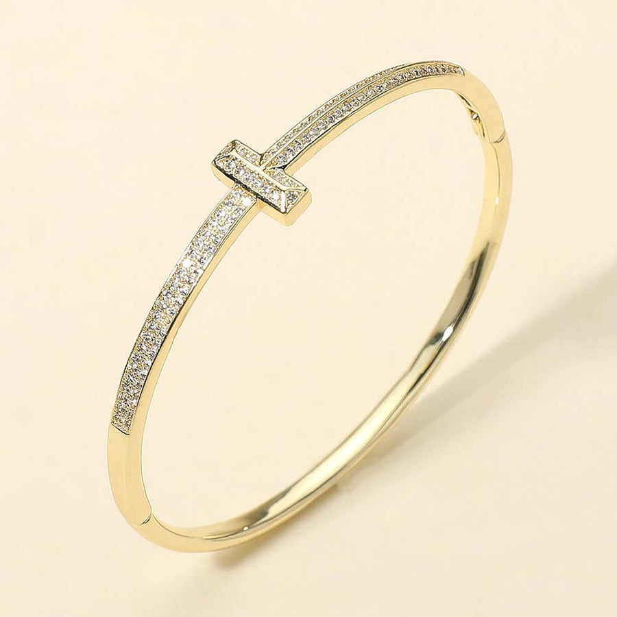 Gold Plated CZ Stone Paved T-bar Hinged Bangle Bracelet: Gold