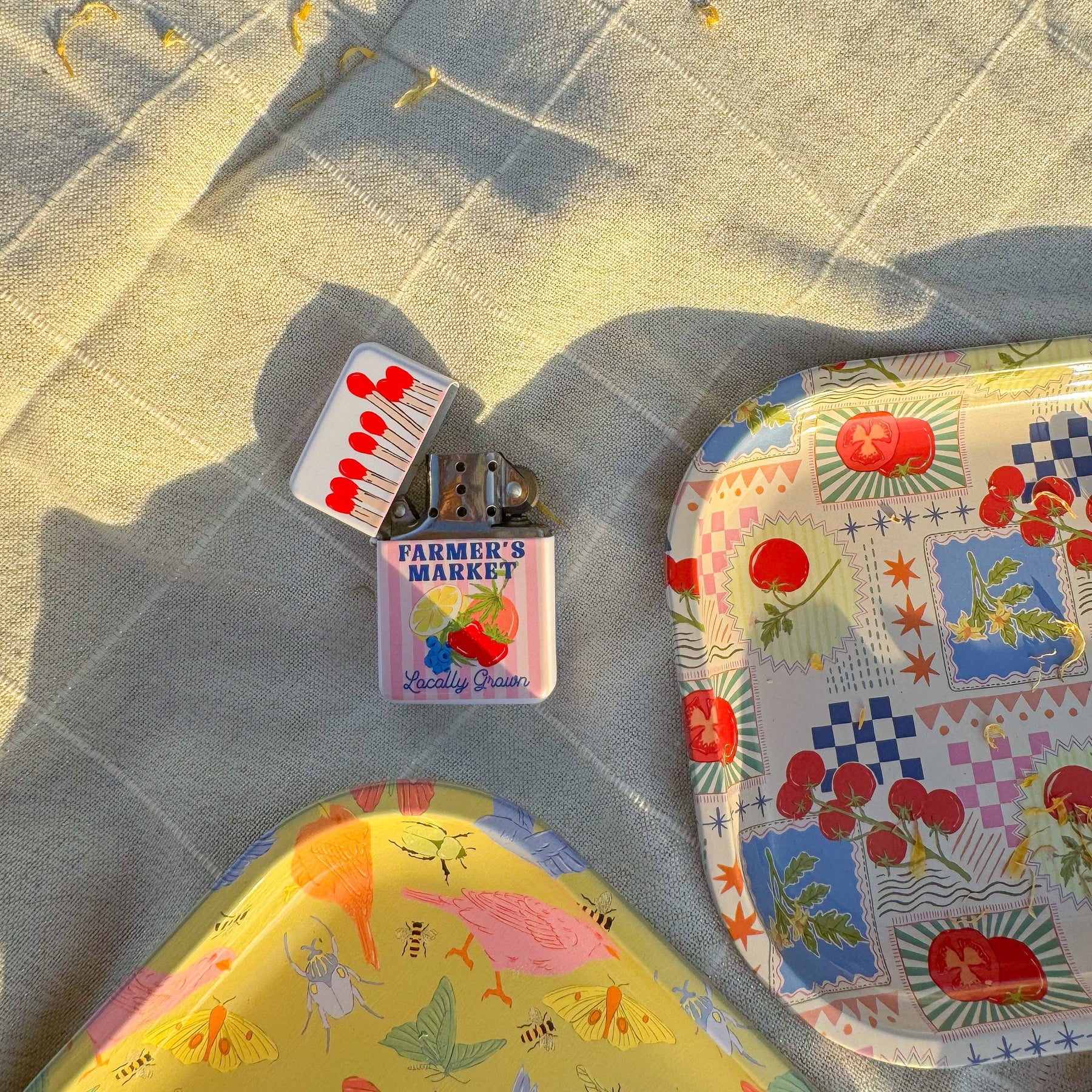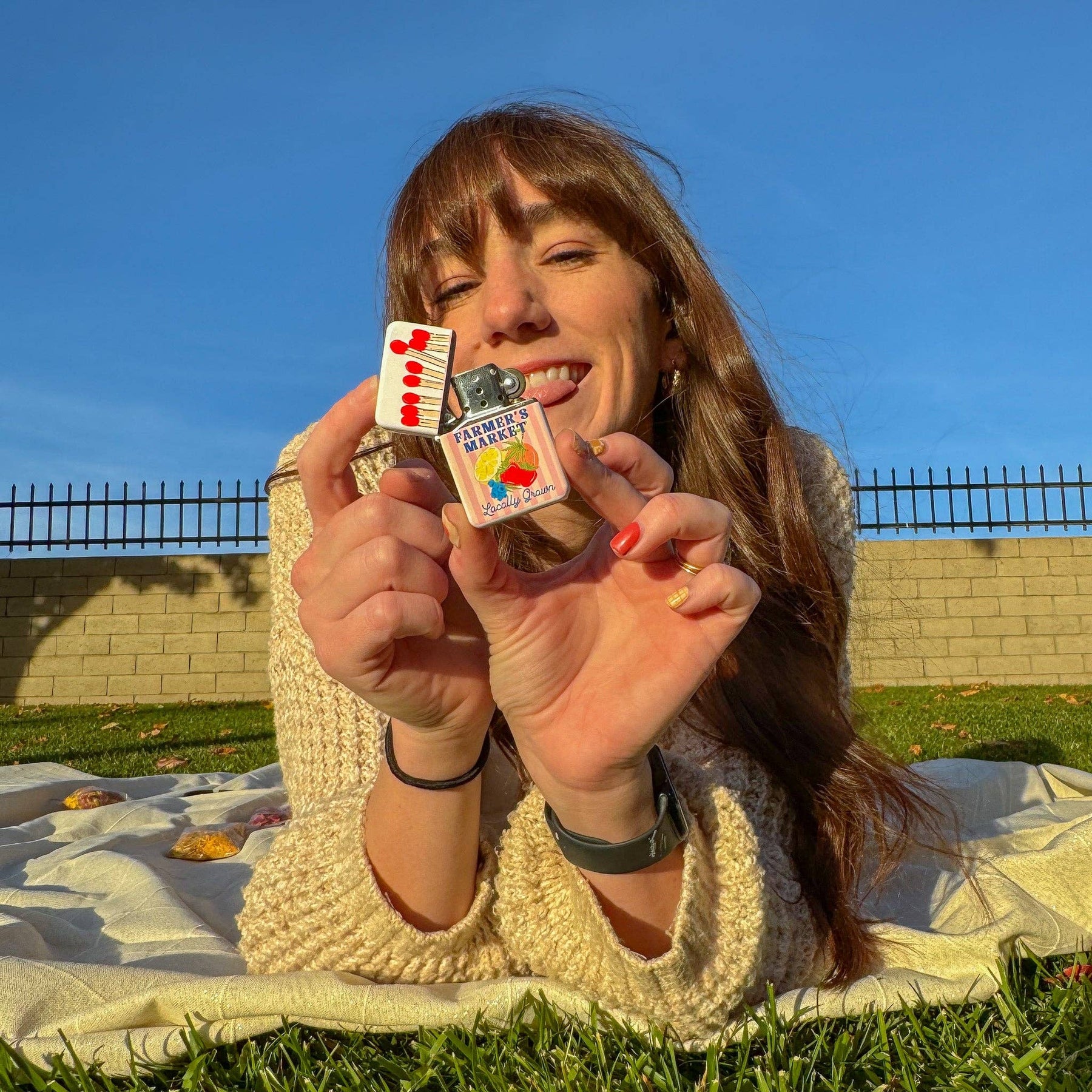 This refillable rectangular lighter combines vintage matchbox vibes with modern convenience, featuring original artwork by Allie! This lighter makes for a great gift for the stoner in your life! They do not come pre-filled so they will not light until you fill the base. Any standard lighter fluid will work.