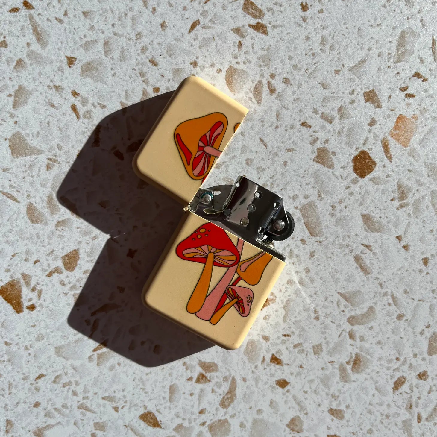 This lighter features a cute little fungi fam on the front and perfectly matches our magic mushie cones!