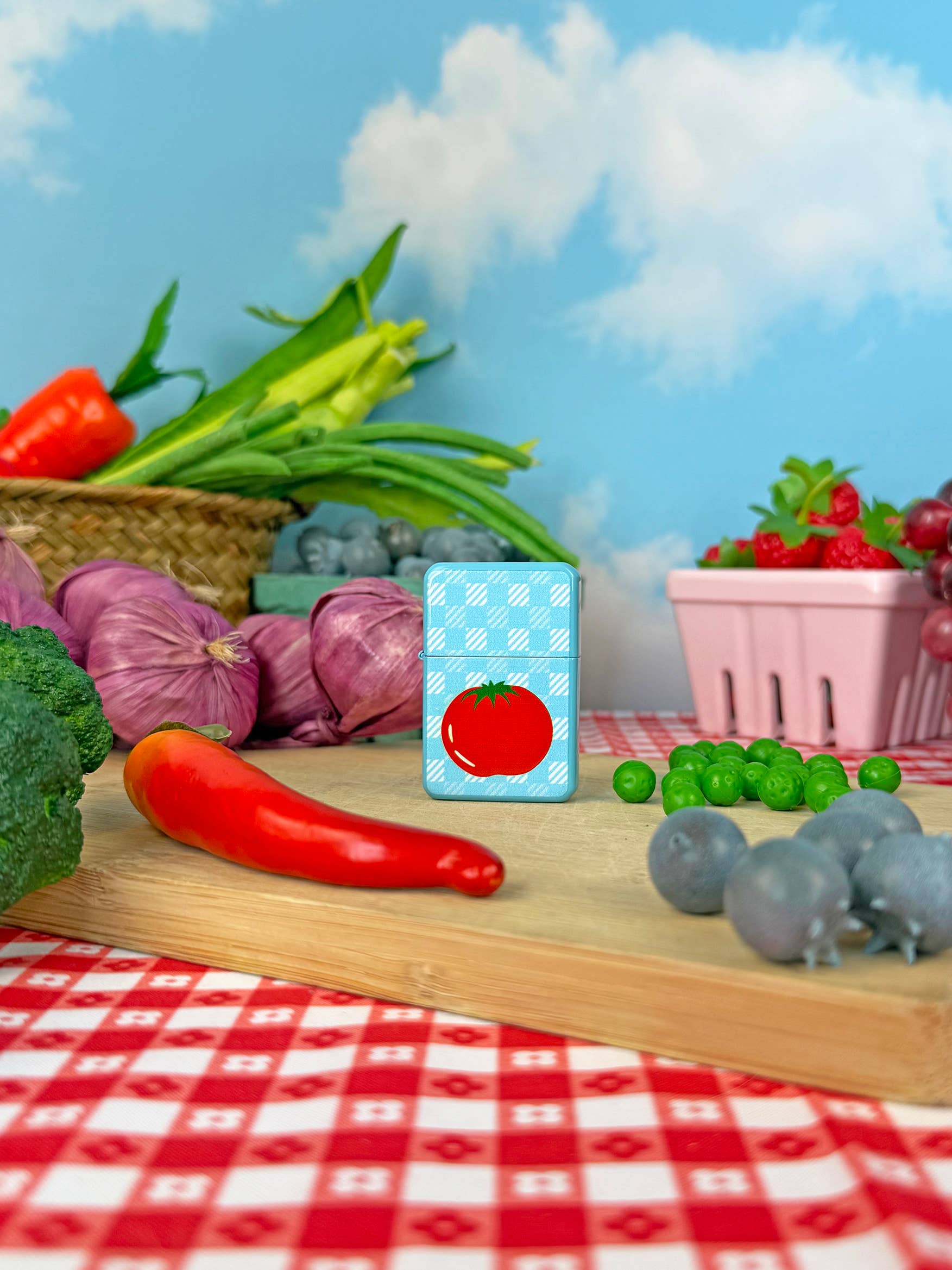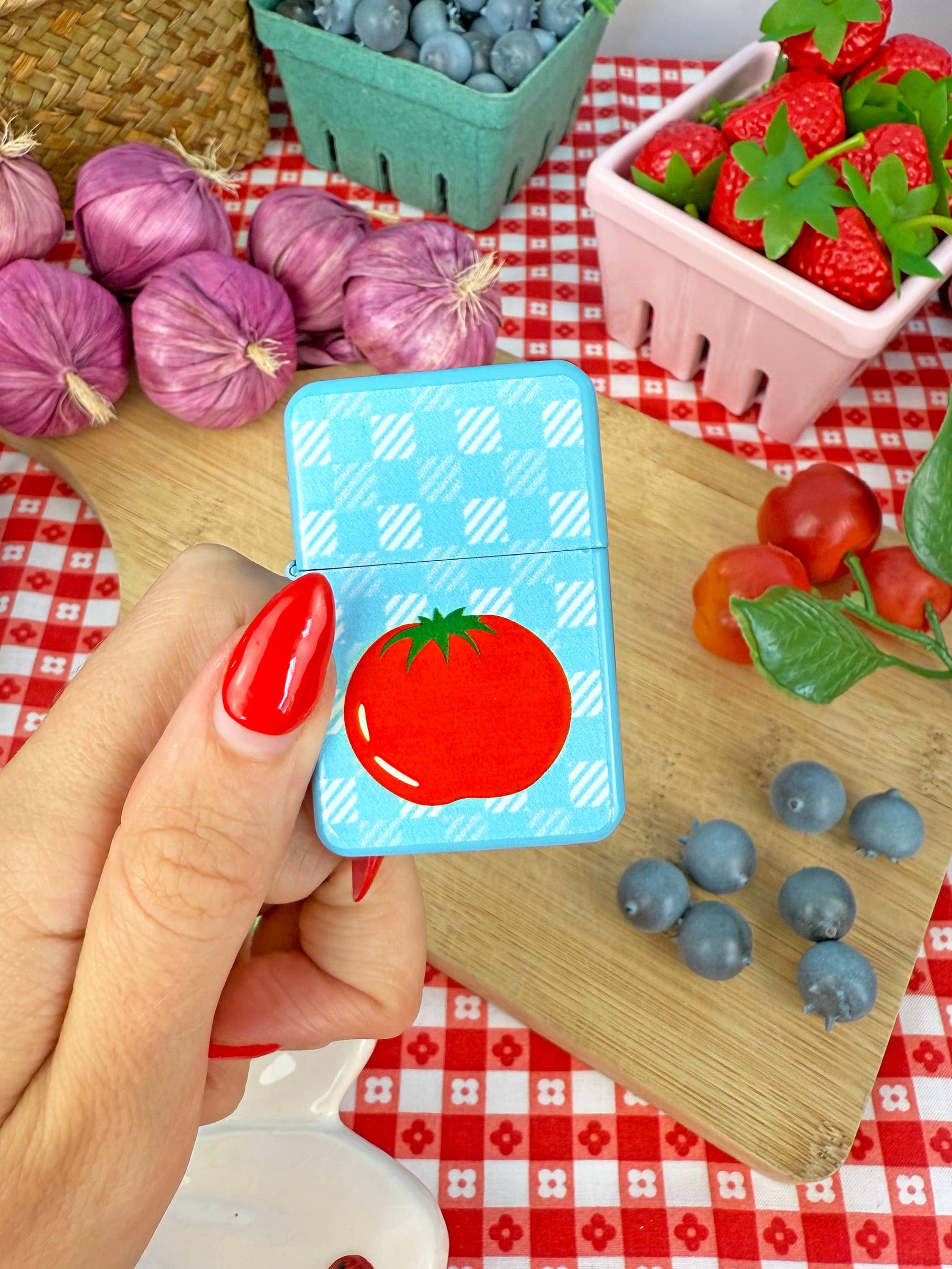 Picked straight from the Burning Love garden! This blue gingham lighter features a cutie little red tomato with a green stem - yummy! Perfect for lighting cigarettes, candles, or whatever else you need a fire for! These lighters are REFILLABLE! Lighter fuel not included. Lighter ships empty and needs to be filled with lighter fluid to ignite! The casing is high quality metal, this is a product you can use over and over and will last you for life if taken care of properly! They are very similar to Zippo lighters and can be filled and re-filled the same way. To fill the lighter, open the top and take the body out of the case. Flip the felt up and soak cotton with lighter fluid. For further instructions you can google how to fill a zippo lighter- they work the same exact way! Please be careful when using this product and keep away from children!