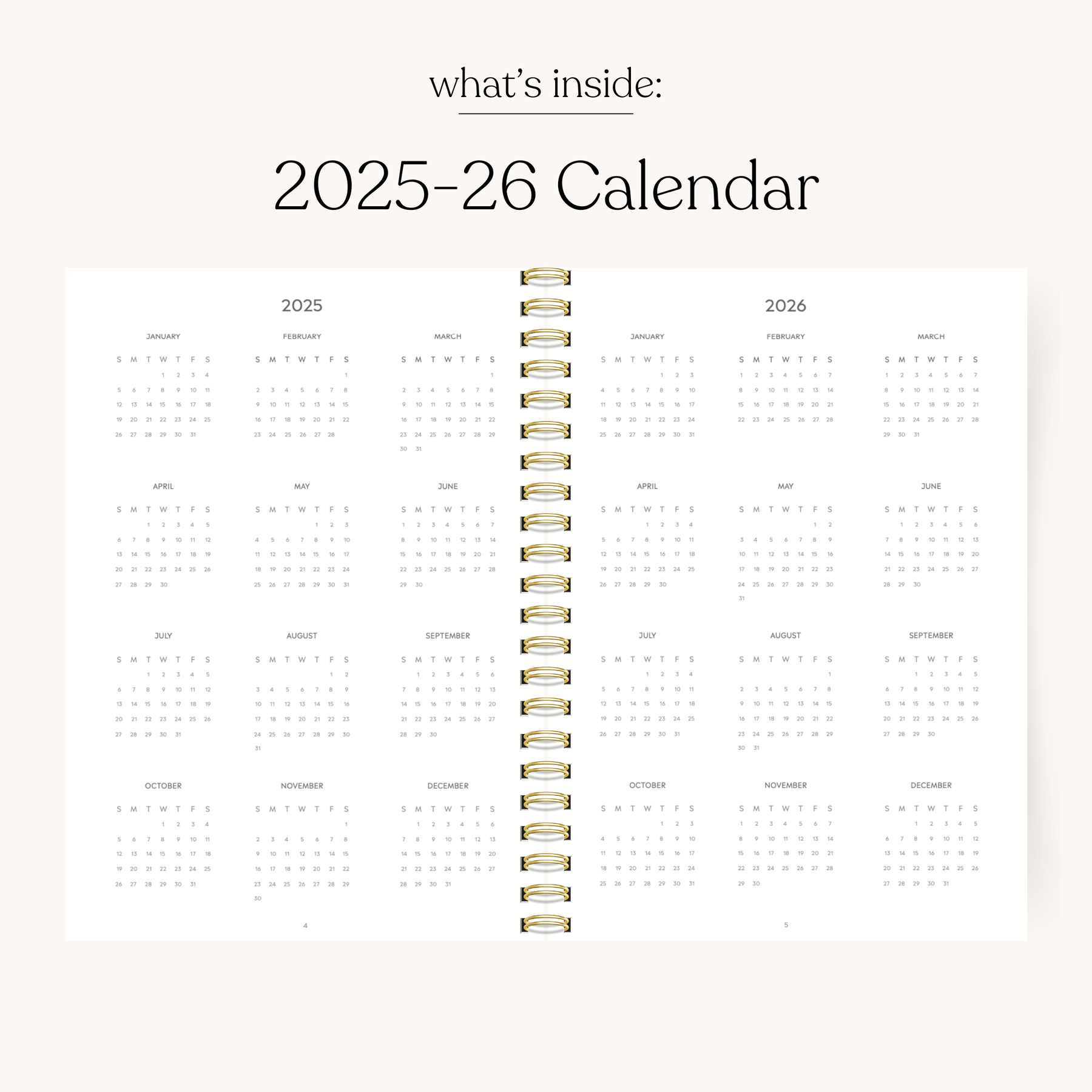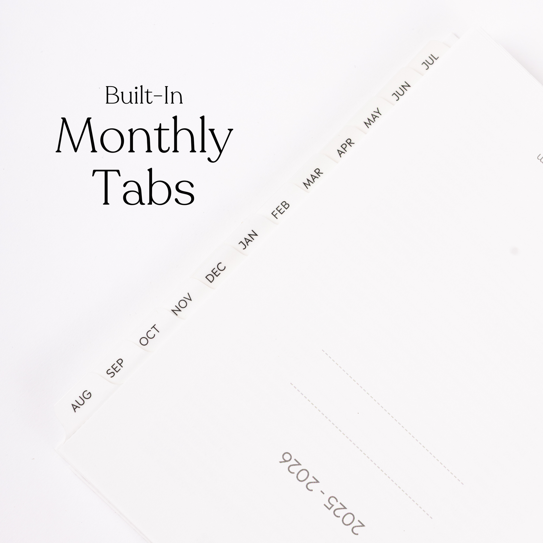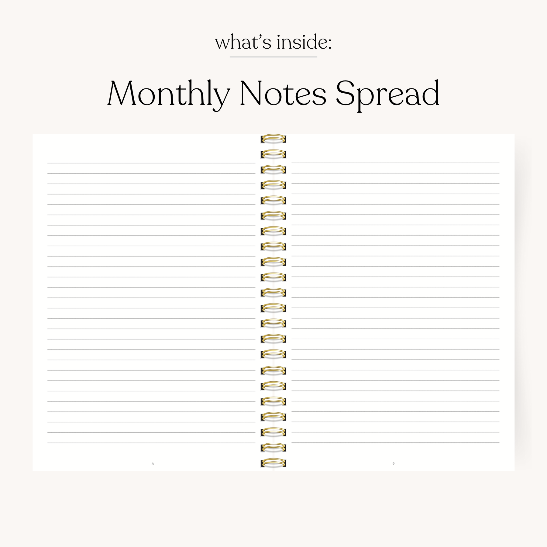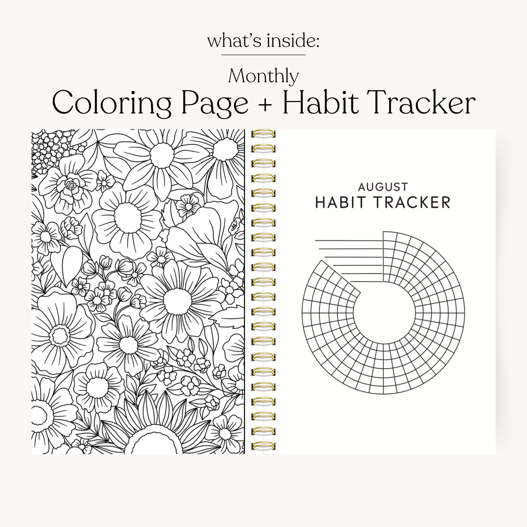 Planner Details - 12 Months: August 2025 - July 2026 - Monthly calendar with coloring page, habit tracker, and extra notes page - Weekly calendar for each week - Days of the week on left side of binding, notes page on right side - 7 Additional Note Pages in back - Built in monthly tabs Materials - Solid color inside and back covers - Thick 70lb. recycled paper - Durable, library-quality wire-o gold binding - 100lb laminated soft-touch cover - Back folder pocket with 3 sticker sheets included -Plastic free packaging -Paper weight is 120gsm/80lb