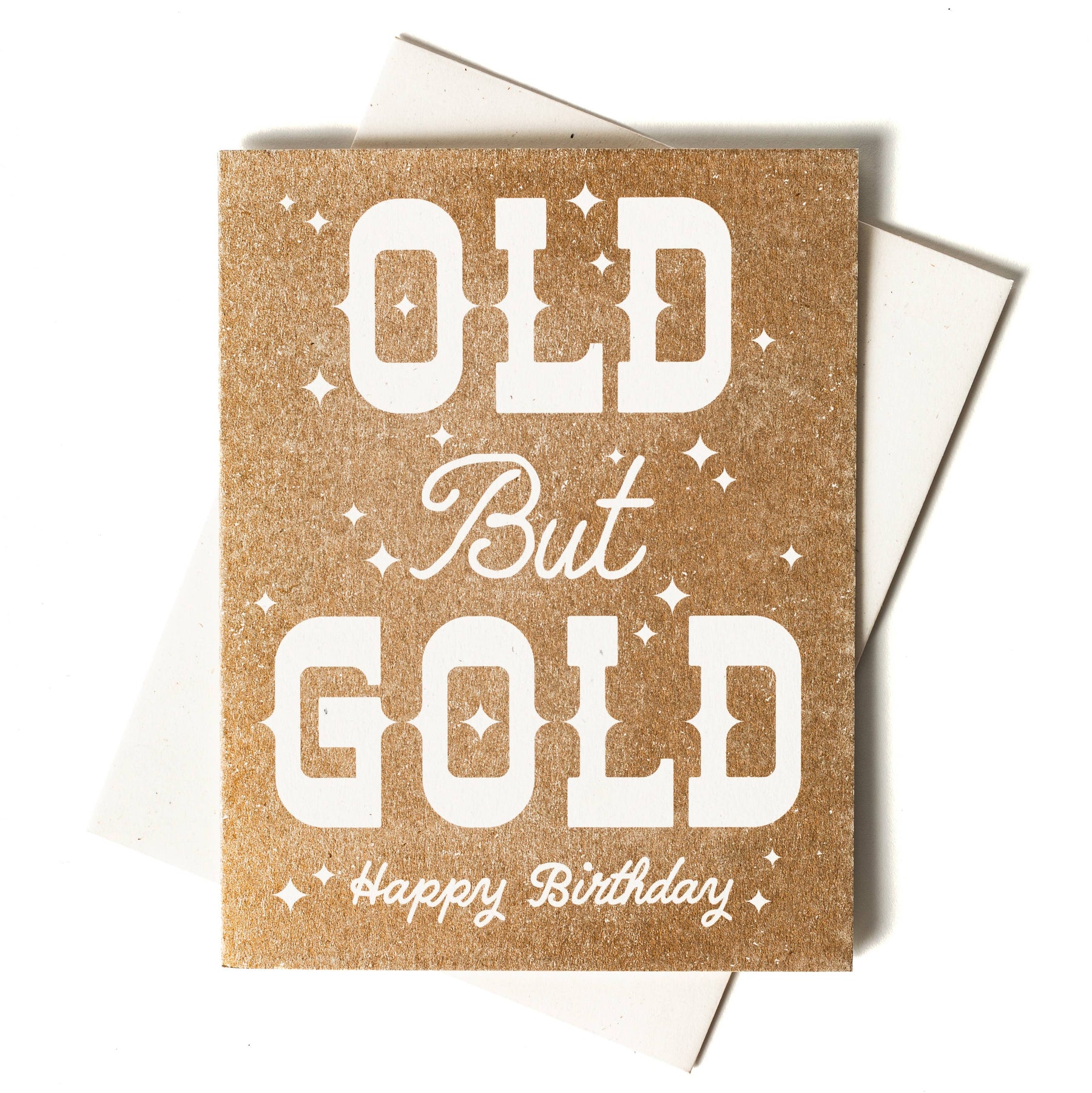 You may be old, but baby you are GOLD! Sparkle, it's your birthday. Risograph printed in metallic gold. - A2 folded card, blank inside - White envelope - Eco-friendly, vegetable-based ink - Printed on 100% recycled, FSC-certified fiber-fleck cardstock - Commercially compostable sleeve