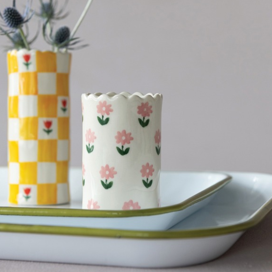 This handcrafted stoneware vase is a beautiful addition to any room, with its charming scalloped edge design adding a touch of elegance. The neutral color allows it to seamlessly blend in with any decor style, while the 2-1/2" diameter and 4-1/4" height make it perfect for displaying your favorite flowers or greenery. Whether in your home or office, this vase will add a touch of sophistication to your space. Made with care and attention to detail, this stoneware vase is sure to be a timeless piece in your collection.