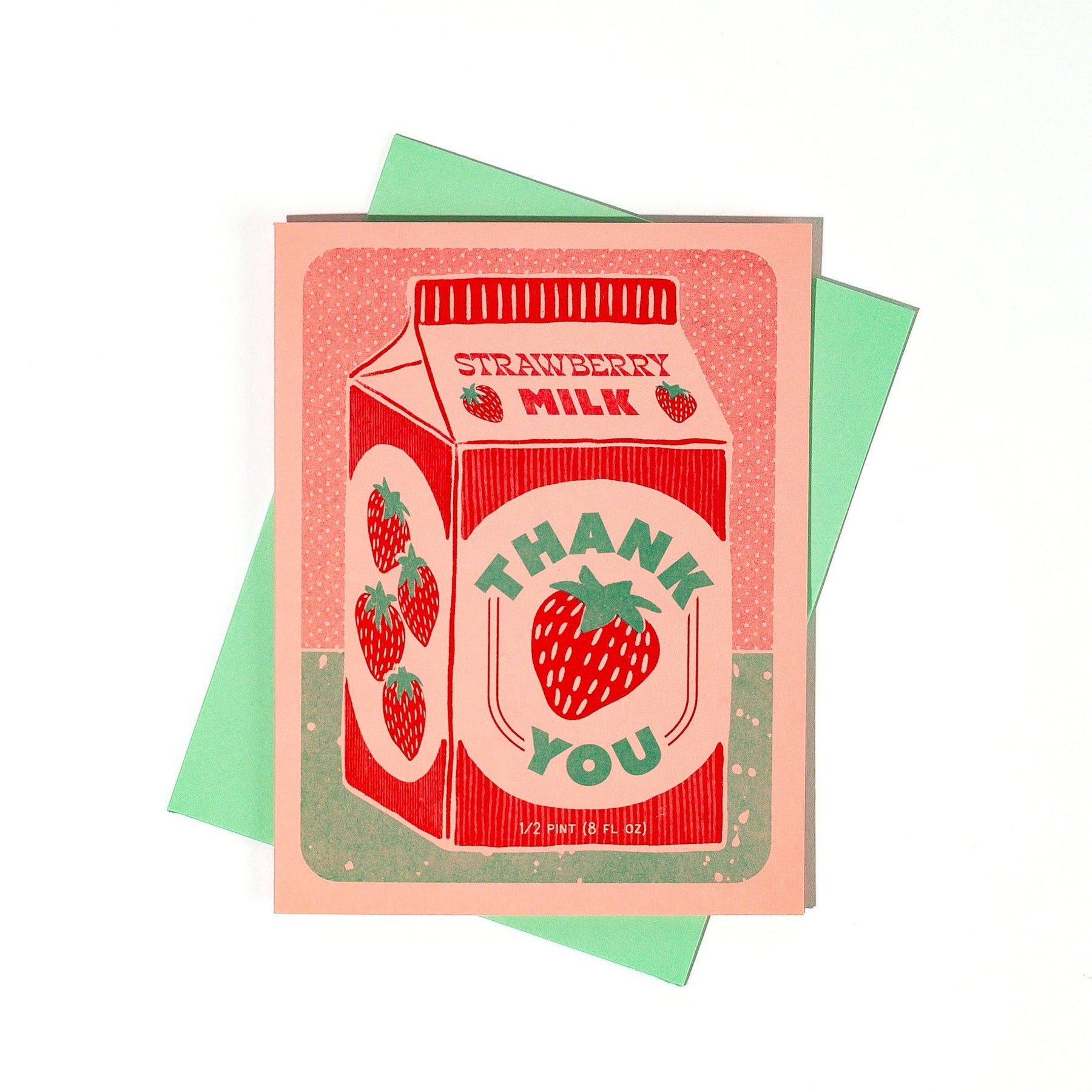 A sweet thank you card featuring a little carton of strawberry milk. Risograph printed in seafoam and bright red ink on pink paper. * A2 folded card, blank inside * Contrast envelope * Eco-friendly, vegetable-based ink * Printed on 100% recycled, FSC-certified fiber-fleck cardstock