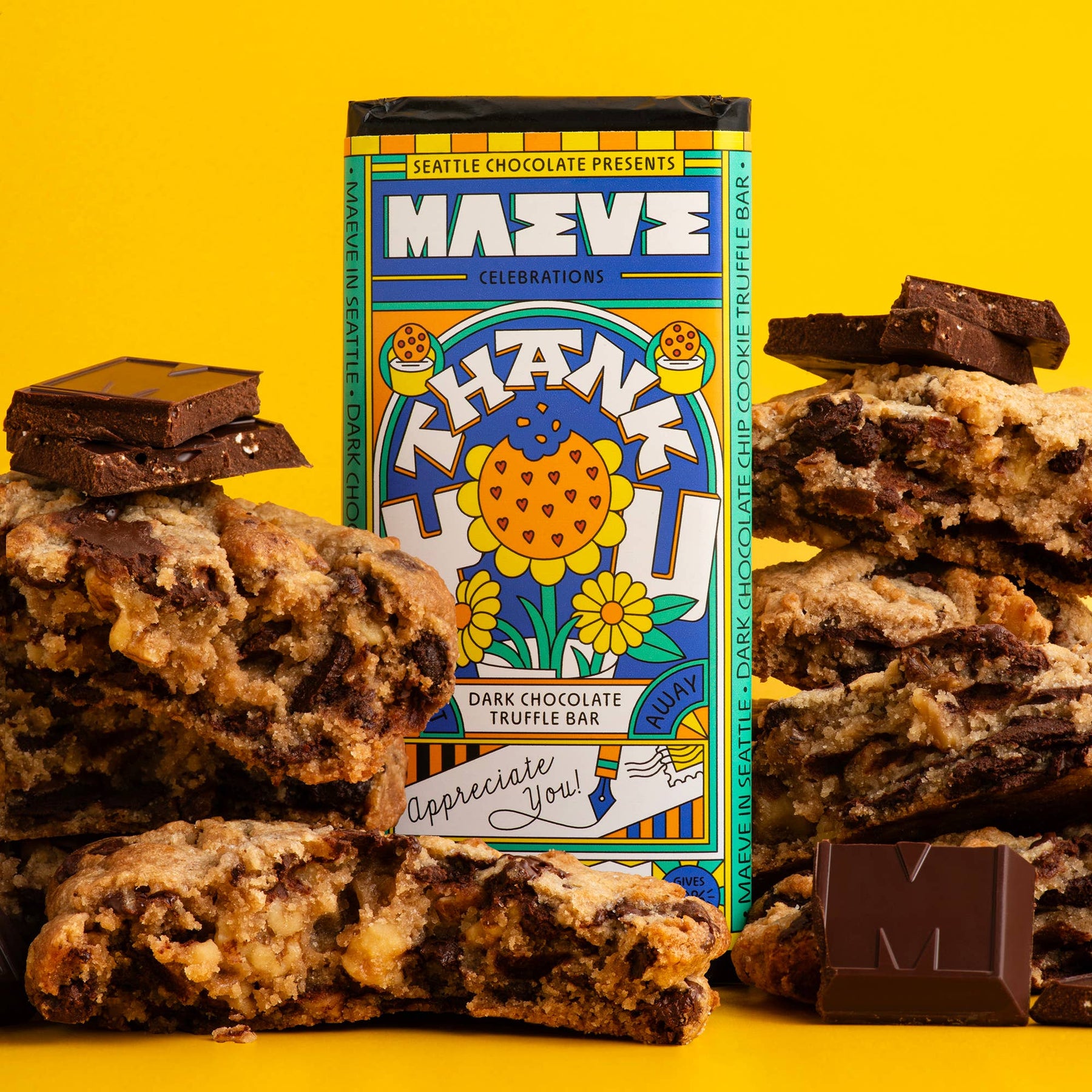 Showing your gratitude with a gratuitous amount of cookie crumbles and dark chocolate. Flavor: Fudgy dark chocolate with crunchy vegan cookie bites. Explore more fun flavors that celebrate life's big & small moments: Happy Birthday and Sip Sip Hooray When you pick Maeve, you’re choosing a sustainably sourced, eco-conscious, woman-owned brand — and you’re also choosing FUN. • Woman-owned and led • 10% net profits donated to cocoa farmers • Ethically sourced, non-GMO chocolate • Carbon neutral