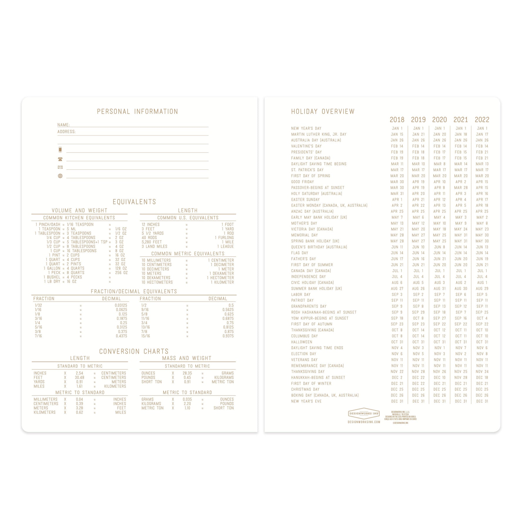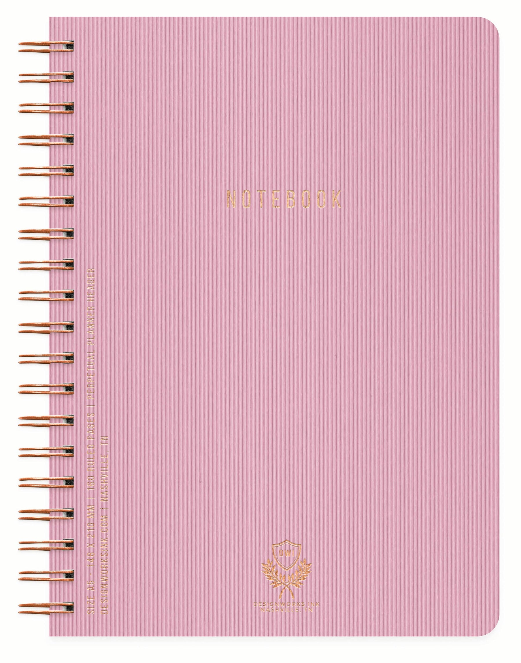 • Small Journal: 6" x 8.25" | • Textured Paper Notebook with Gold Twin Wire Spiral • 160 Lined Perforated Pages with Lined Perpetual Interiors • Personal Information Page on Inside Front Cover • Equivalents Page on Inside Back Cover • Gold Foil Accents • Printed with Soy Based Inks on 100 GSM