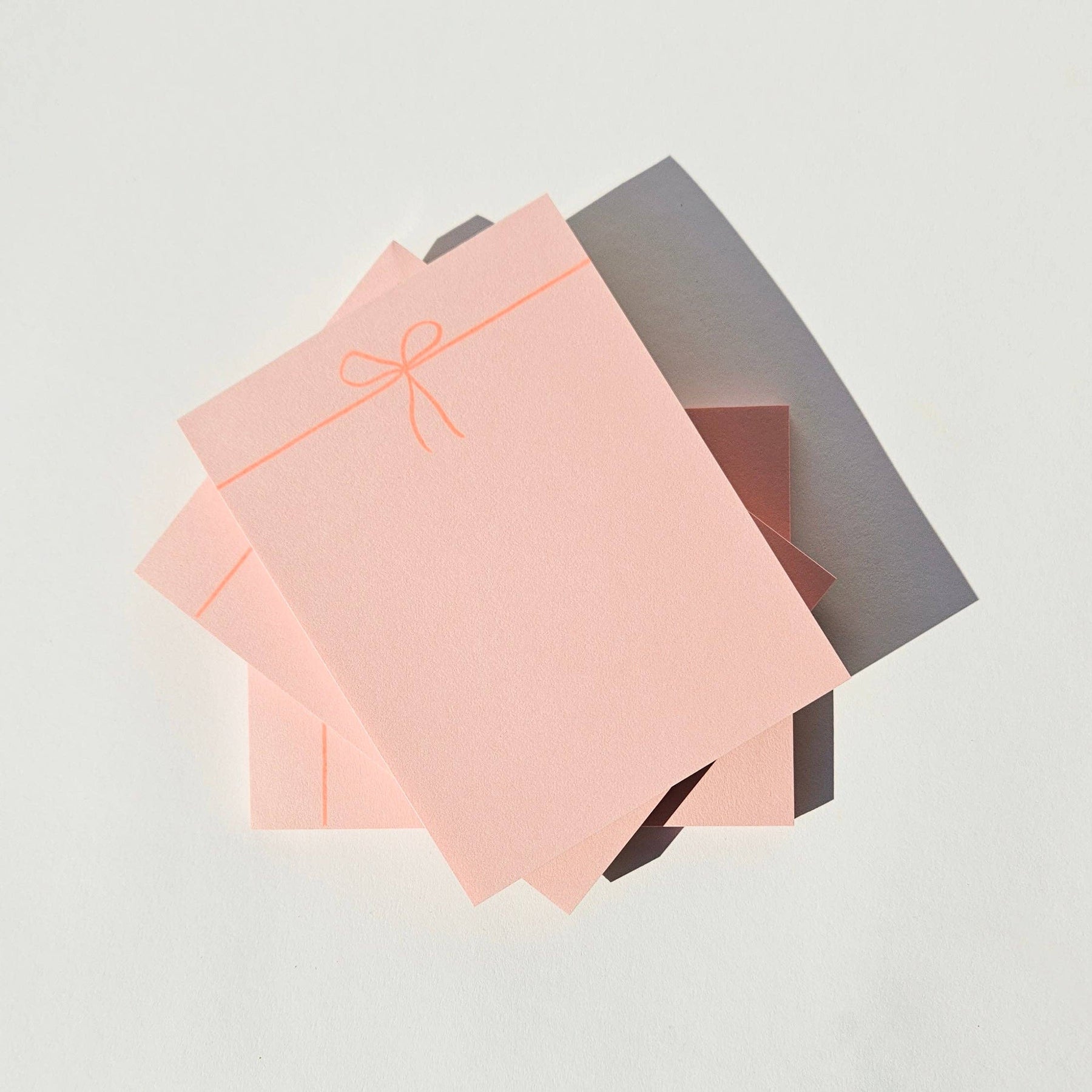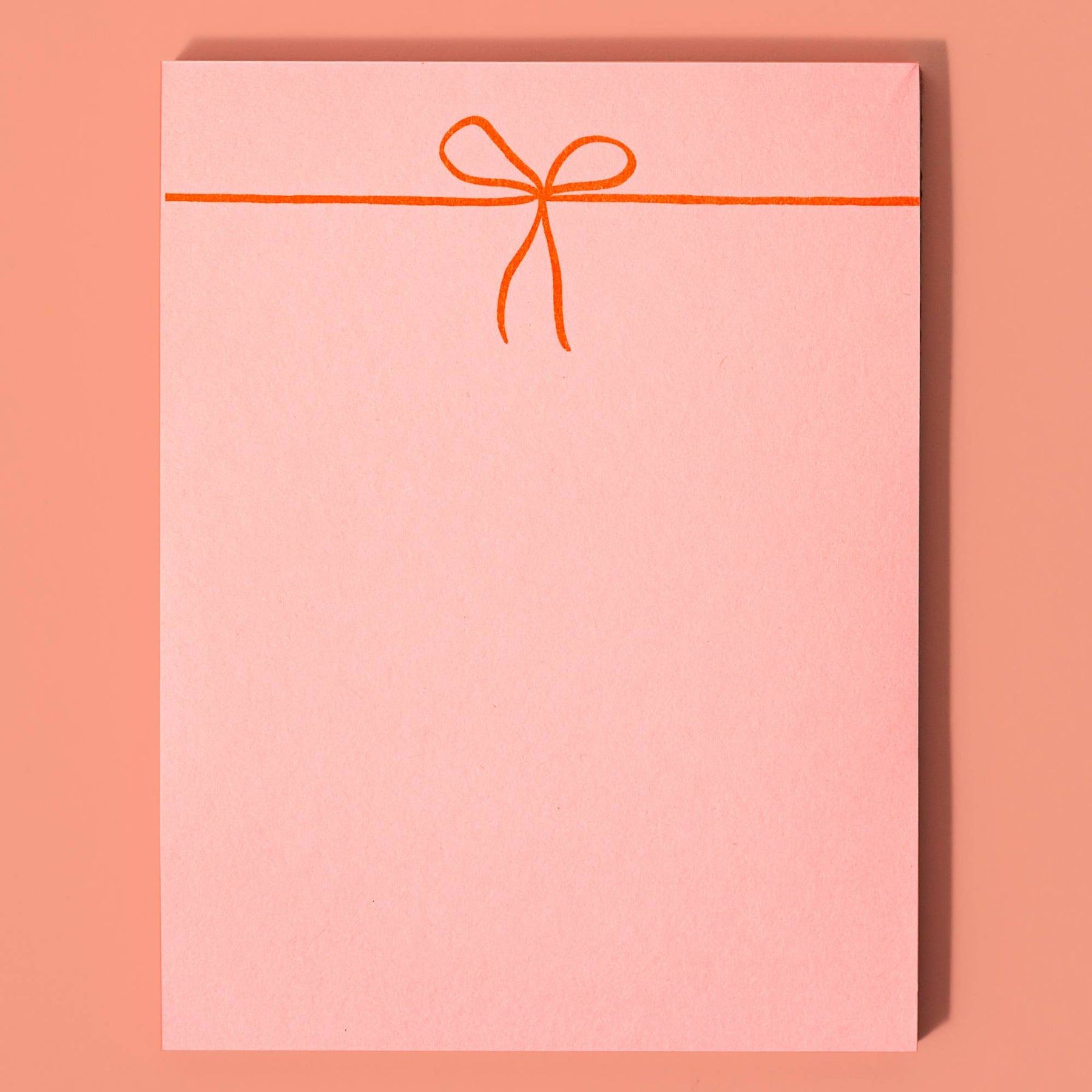 These A2 size pads are just the right dimensions for notes to grab and go with, featuring a coquettish bow tied at the top of an unlined page to jot lists, reminders, or tasks on, with 52 colorful tear-off sheets on a chipboard backer. Risograph printed in fluorescent orange on pretty pink paper. - 52 tear-off pages - Paper belly band packaging, no sleeve - Eco-friendly, vegetable-based ink - Printed on 100% recycled, FSC-certified fiber-fleck cardstock