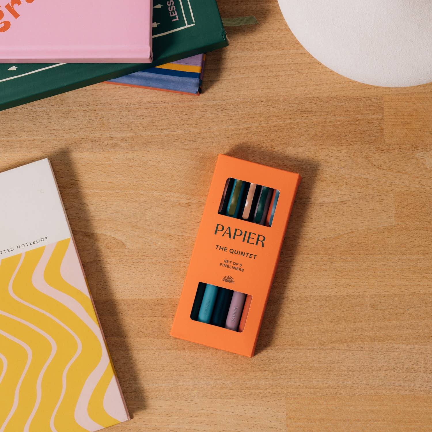 Add Papier's Quintet Fineliners to your product selection - one of Papier's absolute best-selling items, its the perfect tool for customers looking to add vibrant color to their notes, sketches, and to-dos. This set includes five bright shades, offering a fun and free-flowing writing experience. A must-have for retailers looking to offer a high-quality, colorful product that brings style and creativity to everyday tasks. Ideal for customers who love to add personality and flair to their stationery. Product Details: - Materials: Pen barrel - PP, Pen Clip: carbon steel, matte finish - Nib type: fineliner - Ink-type: Water-based ink in green, peach, purple, blue and navy - Packaging: uncoated paper - retailer-friendly box with window - Size: Each pen measures 5.4 in x 0.4 in - Includes 5 Pens All of Papier's desk treasures are high-quality and made to last, with plastic-free packaging you can recycle at home.